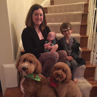 After awhile we decided to go get Adam who was so excited to see what Santa had brought. He could spy from the top of the stairs a stuffed Darth Vader so the morning was already off to a great start for him. Before he could get a closer look it was time for the traditional staircase photo - this year with two new additions - who both behaved so well (of course one of them was sleeping...)