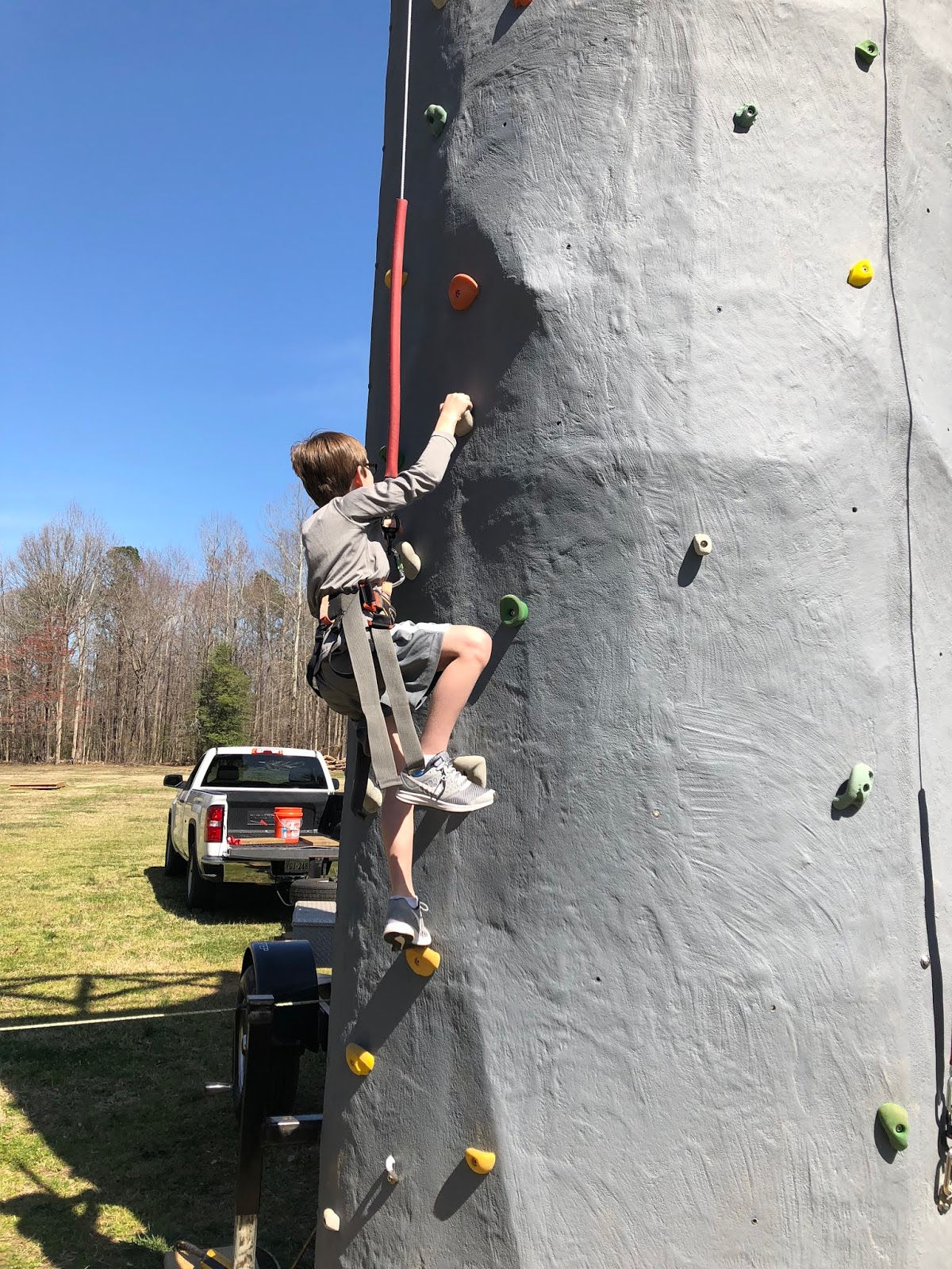 The campground added a new activity to their Easter weekend - a rock climbing wall. This thing was awesome and Adam had so much fun climbing it. He was able to reach the top on the "easy" side and got sooooo close on the "medium" side. He really is a good climber and I'm looking forward to taking him to some indoor walk climbing walls soon.
